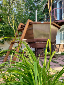 Банный чан с приварной печью печкой изготовлен из пищевой стали. Представляет собой большую ёмкость в виде чаши, при нагревании которой можно париться на свежем воздухе. Банный чан установлен на металлическую подставку и оснащен приварной печью с водяной рубашкой. Благодаря циркулирующей внутри печи воде чан быстрее нагревается и медленнее остывает. В комплект такой модели входит трёхметровый разборный дымоход. Чан оборудован кедровым бортом, скамейками, подспинниками, трапом для ног и приставной лестницей.