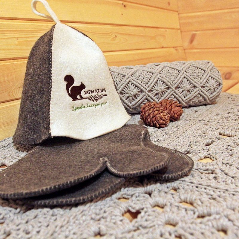 Комплект: шапка, тапочки, рукавица с фирменным логотипом будут отличным дополнением к бане, защищая от высоких температур и подчёркивая вашу индивидуальность во всём!